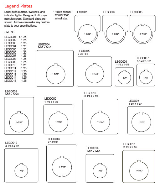 Whether there’s going to be a lot on your plate or merely a word or serial number, our quality, industrial-strength plastic tags fit the task and the equipment. We manufacture a number of standard legend plates in all colors and sizes, as well as custom shapes, right here in our American factory. Unlike tapes and decals that can peel, these durable plastic plates fit securely around switches and buttons, standing up to gloves and tough environments.